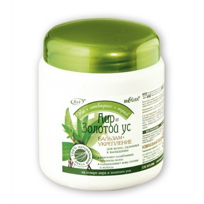 Бальзам-укрепление содержит полезный отвар аира и золотого уса. Усиливает действие шампуня-укрепления Аир и Золотой ус для волос, склонных к выпадению: укрепляет корни волос и способствует их росту. Придает волосам гладкость и эластичность. — укрепляет ослабленные луковицы волос — придает волосам здоровый вид и живой блеск - без красителей, - без силиконов Аир болотный — издавна применяется как средство против выпадения волос. Золотой ус — «домашний доктор» — обладает уникальной целебной силой, благодаря флавоноидам, антиоксидантам, минералам и витаминам.